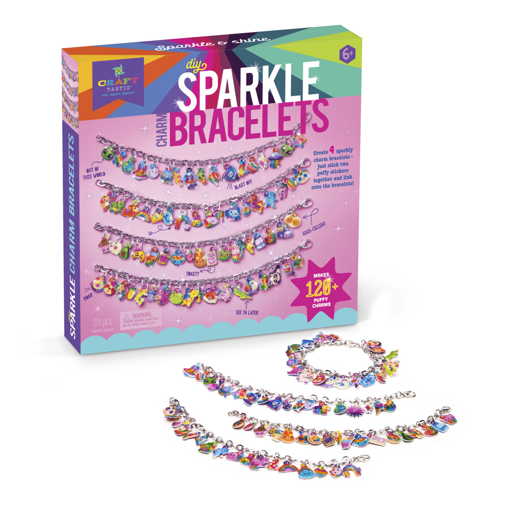 Get your shine on when you make these four sparkle charm bracelets to wear or share! It’s easy and fun to make – simply stick two puffy stickers together to make a charm and link it onto a bracelet. There are wild animals, mythical creatures, breakfast foods, and space-themed charms to choose from so you can create a bracelet unlike any other! Ages 6+