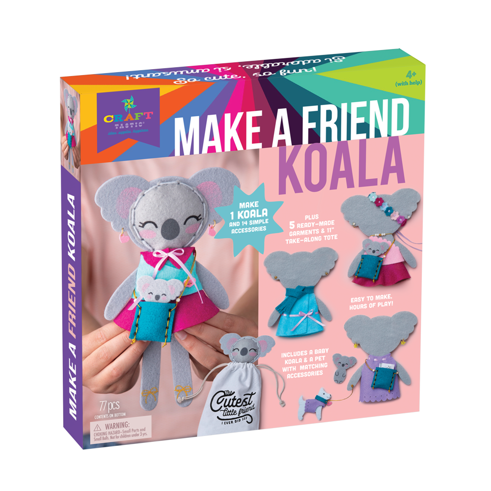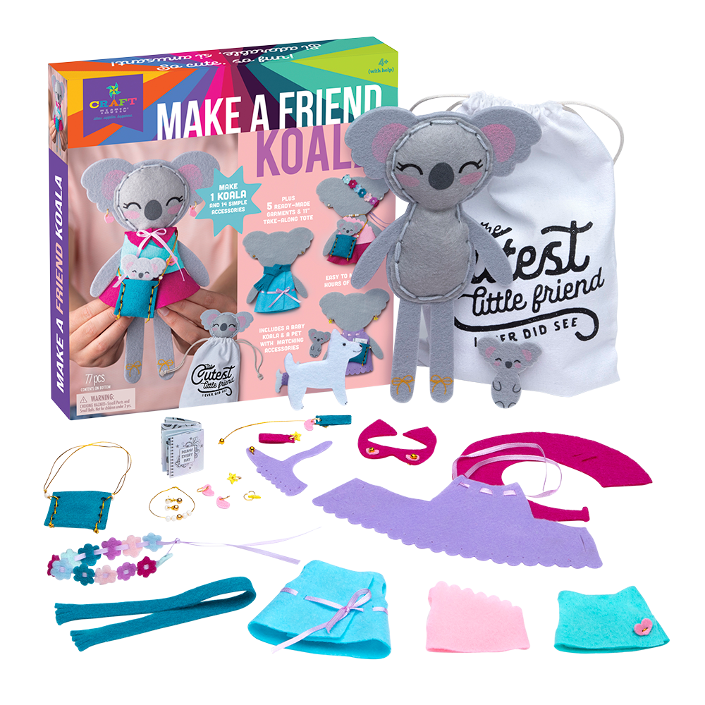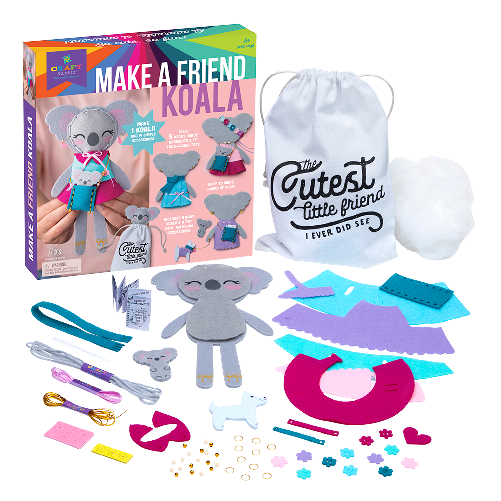 Friendship is in the making with Make A Friend Koala! Prepare for cuteness with this adorable stuffie kids can stitch and stuff themselves! With a few simple instructions they can stitch up and dress up their very own Koala friend with the kit’s ready-to-wear clothes and easy-to-make accessories. This adorable kit comes with 1 drawstring bag, 28 pc felt, 9 pc glitter foam, 20 plastic beads, 10 metal rings, 1.5 yds acrylic yarn, 1.4 yds polyester ribbon, 1 plastic needle, 0.4 oz polyester stuffing, 2 yds elastic cord, 1 pc printed paper, and instructions. Ages 4+