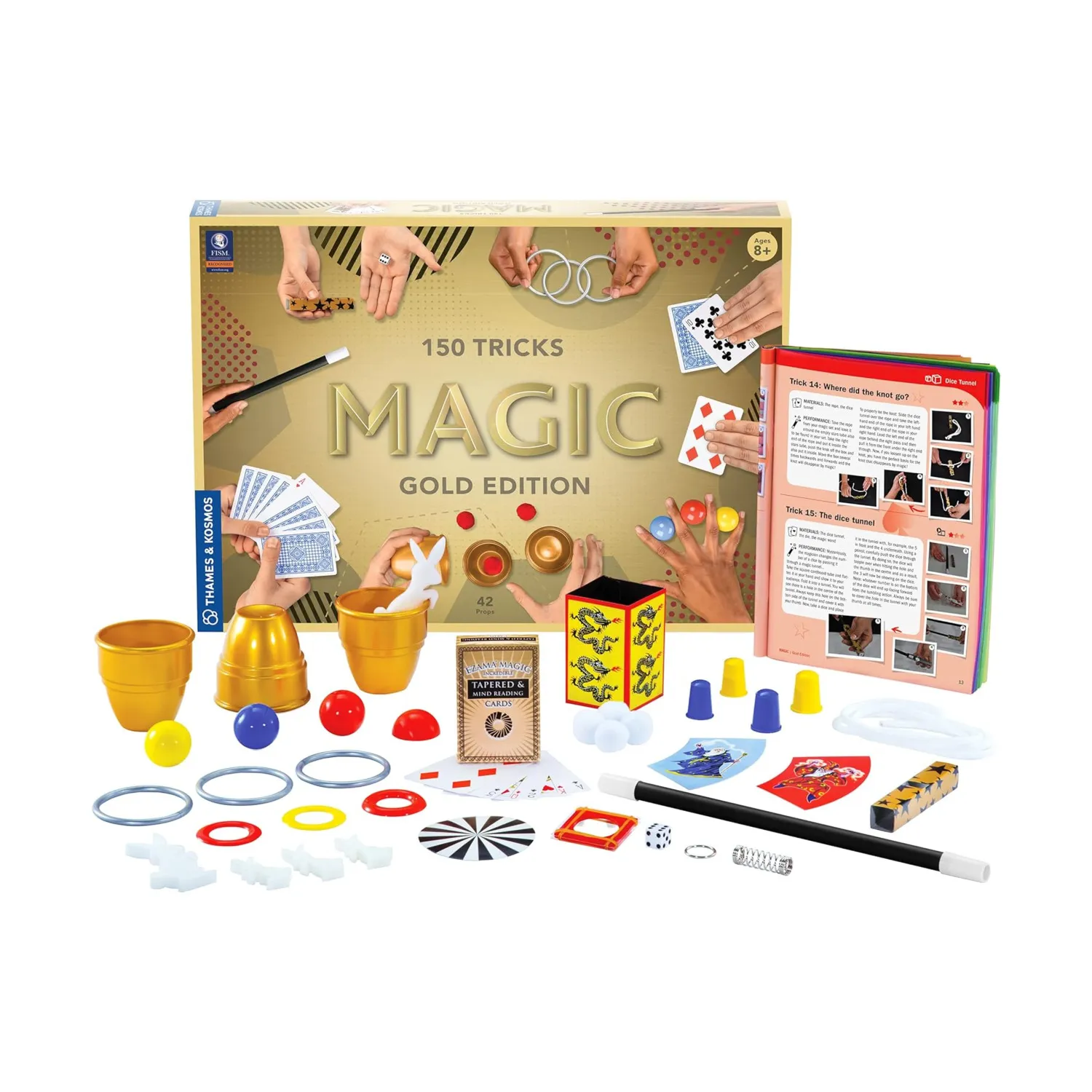 Magic Gold Edition offers an extensive collection of 150 amazing illusions and magic tricks suitable for ages 8 and up. This comprehensive set includes props like playing cards, ropes, cups, balls, coins, and metal rings to perform astonishing feats such as vanishing objects, levitation, transformations, and mind-boggling guesses.