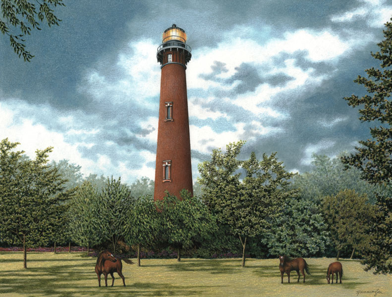 Wild Horses still roam the Currituck Banks on the Outer Banks of North Carolina. Featured in the background is the Currituck Lighthouse, located in Corolla, NC.